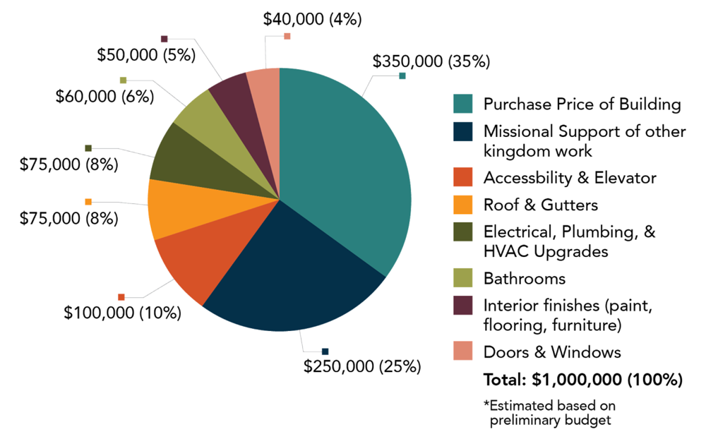 The goal approved by the Board is one million dollars. $750,000 will be spent on the building and $250,000 will be used for a primarily local missions and ministry investment. Our church has been supported, in part, from a missional component of a previous capital campaign and we want to follow in their footsteps.